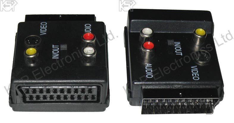 SC-F/SC-M+2RCA+SVHS IN*OUT, SCART 60S SCART-3RCA+SVHS+SWITCH ПРЕХОД SCART-3RCA+SVHS+SWITCH Adapter scart plug scart female 60s + silver + 3x rca s video coupler switch Размери: 60x25x70 мм Тегло: 40 гр. Мъжки/женски SCART адаптер сребрист + 3x RCA + S-Video. Чрез превключване е възможно да се избере IN/OUT сигнал. ,