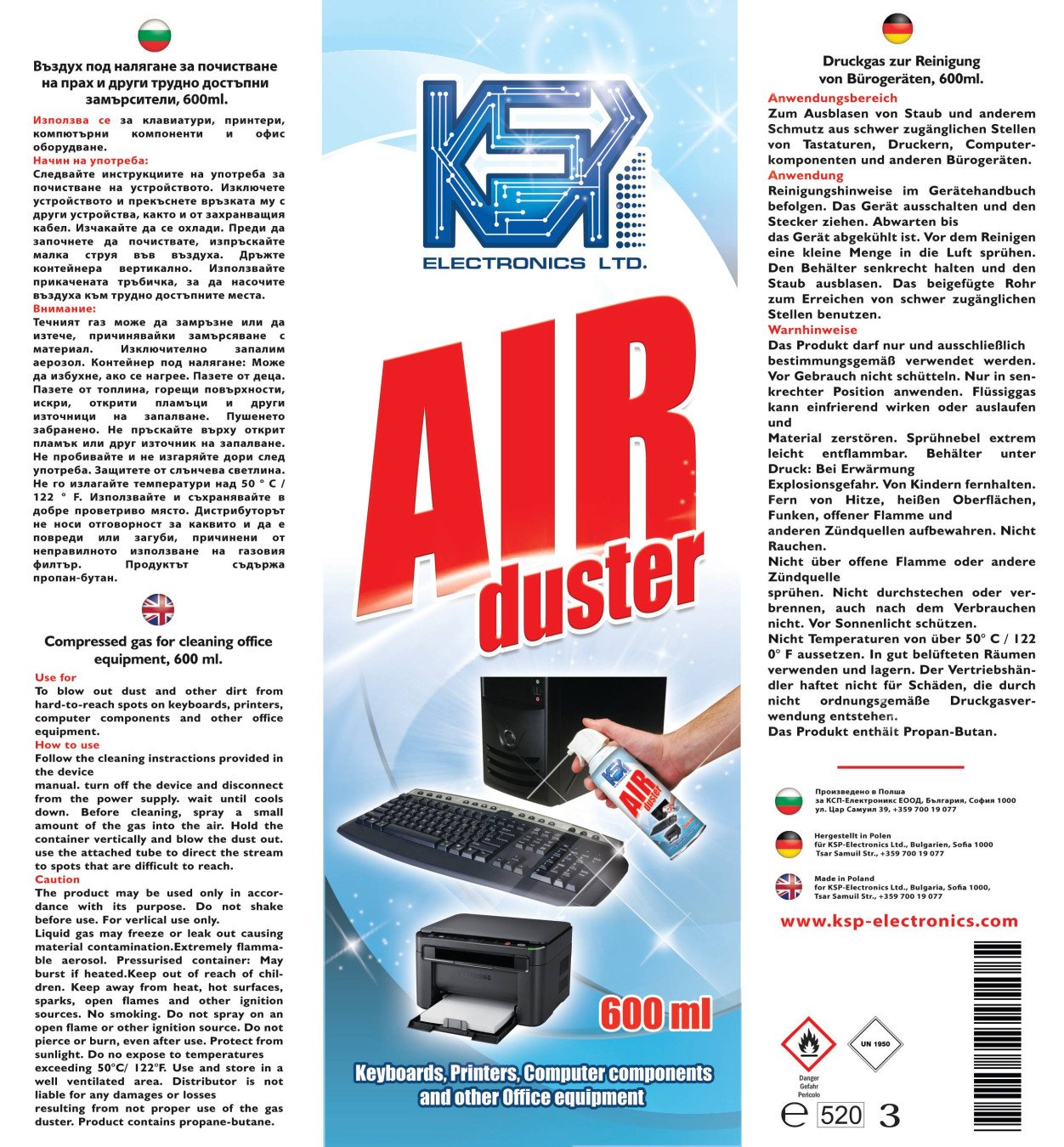 Компресиран въздух под налягане 600ml AIR DUSTER. Подходящ за почистване на офис техника и оптики на CD и DVD.,