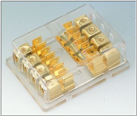 За високомощен аудио клон или клон и окабеляване, като стерео уредба за кола. Разделете 4G захранващия кабел на 8AWG cable inputs, four 8AWG cable Материал: поликарбонатна пластмаса, цинкова сплав. Размери:10,5 x 7,6 x 3,5 см ,