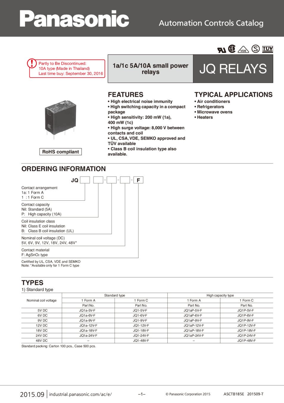 PANASONIC EW Standard type JQ1A-12V AJQ3341 POWER RELAY, SPST-NO, 12VDC, 10A PC BOARD, Desoldering, Реле DC12V/720om,250VAC/5A,20x10x16mm,1-к.гр.(НО),4-изв./раст.-2.54мм,NAIS-AJQ3341/Matsushita,