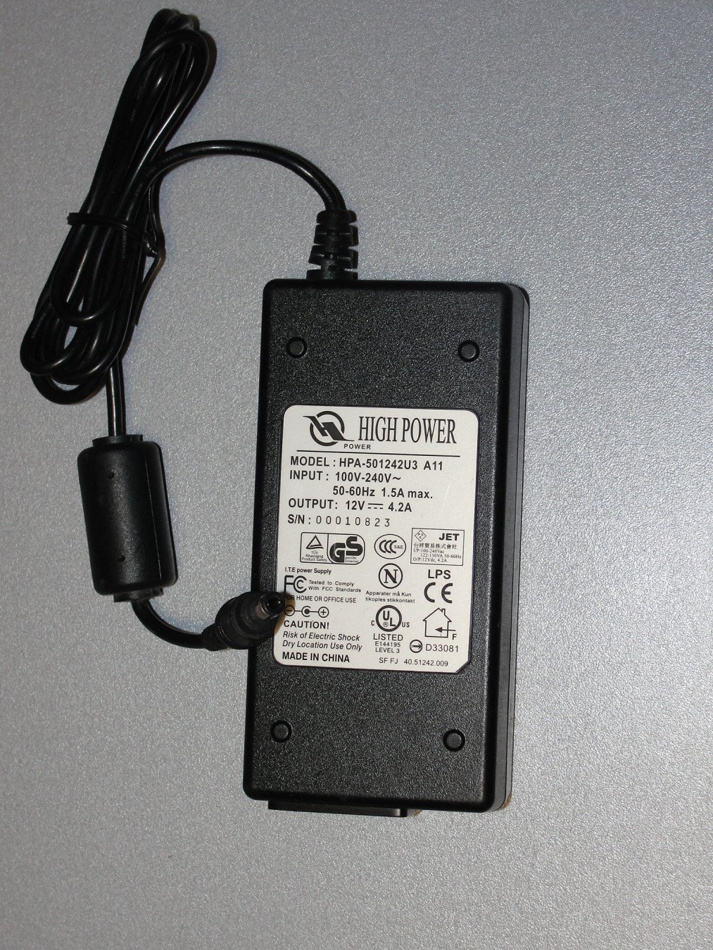 AC/DC HPA-501242U3 INPUT 100-240V 50-60HZ 1.5A,OUTPUT 12V 4.2A, 48 Watts max FOR LCD Monitor,