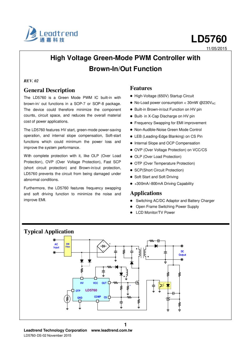 Интегр.схема LD5760DS SO-8-High Voltage Green-Mode PWM Controller with