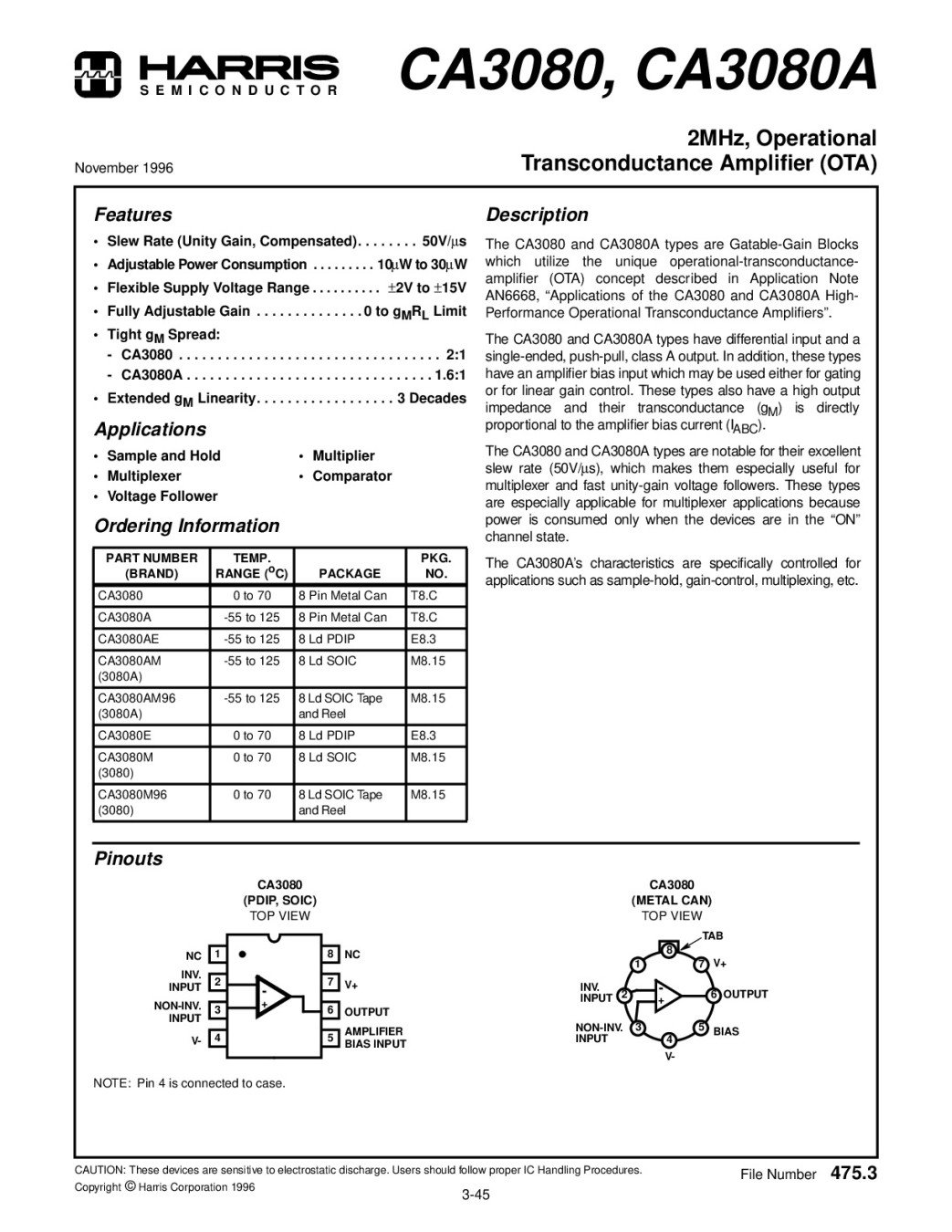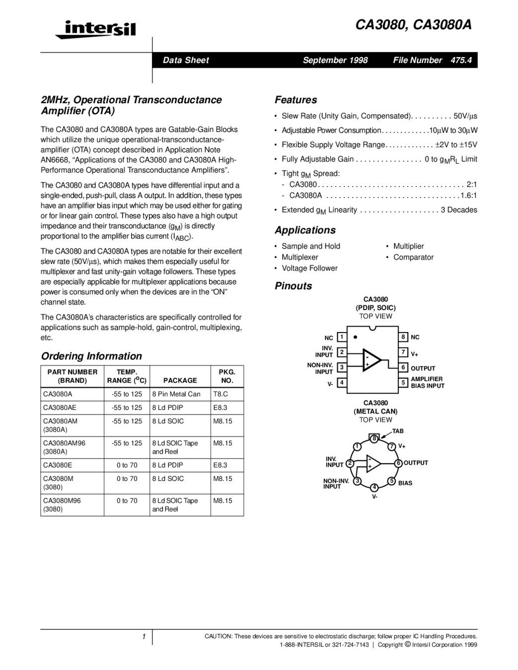 2MHz, Operational Transconductance Amplifier OTA2MHz, CA3080, LM3080N DIP-8,