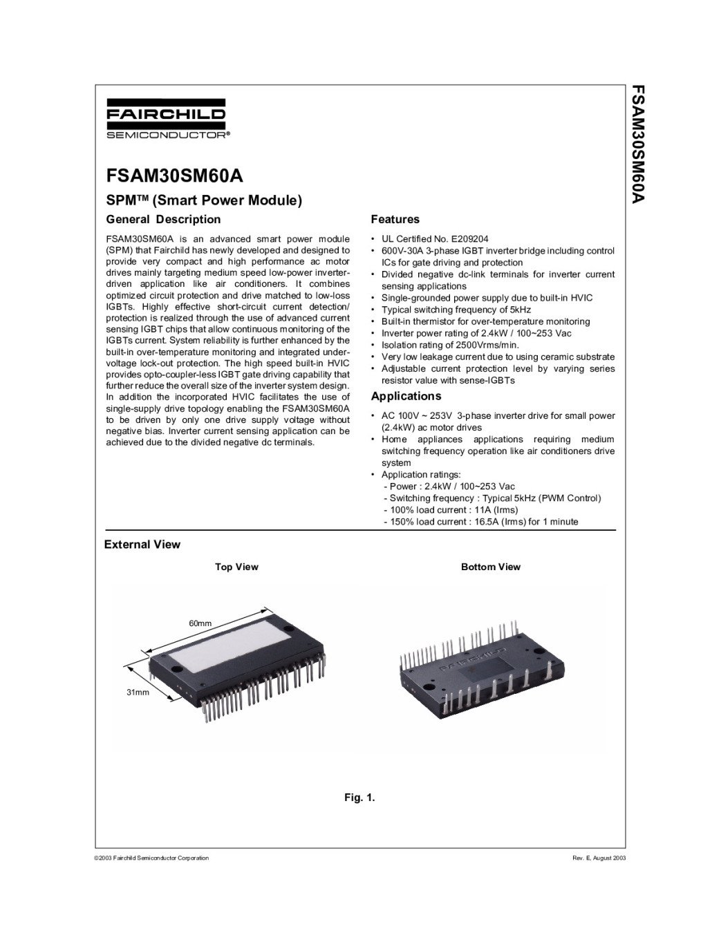 UL Certified No. E209204• 600V-30A 3-phase IGBT inverter bridge including controlICs for gate driving and protection • Divided negative dc-link terminals for inverter currentsensing applications• Single-grounded power supply due to built-in HVIC• Typical switching frequency of 5kHz• Built-in thermistor for over-temperature monitoring• Inverter power rating of 2.4kW / 100~253 Va,