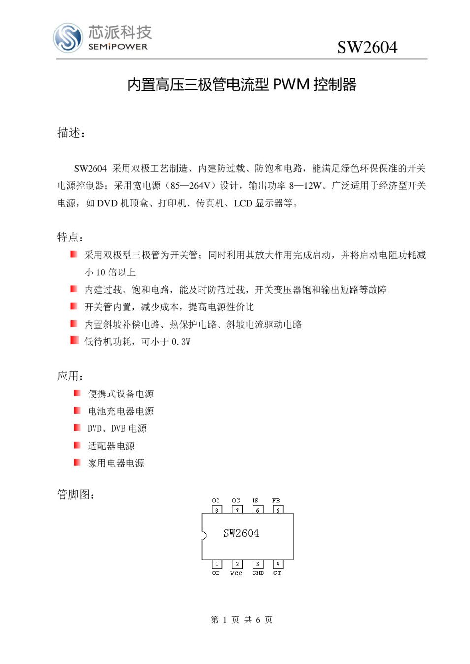 PWM Controller for low-pover univ.Off-line supl.,100kHz,Vcc=16V,8-DIP IC SW2604 8-DIP,